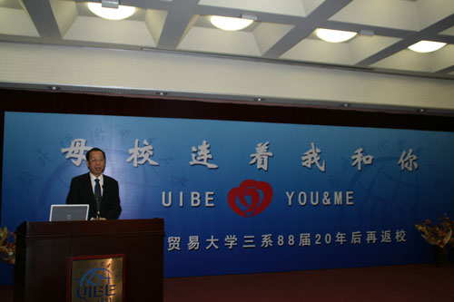 陈准民校长首先讲话,他代表母校对三系88届校友20年后再返校表示热烈欢迎,并着重介绍了过去20年里经贸大学的发展变化。随后,对外经济贸易大学原党委书记、校长孙维炎,原三系系主任黎孝先,我校国际贸易学科权威专家薛荣久,现经贸学院院长赵忠秀先后讲话,欢迎老校友回家并衷心祝愿老校友不断进取,再创辉煌,为母校争光,为国家多做贡献。