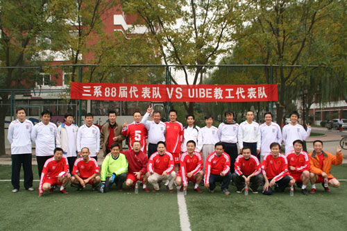 下午两点,三系88届代表队(曾是全校年级冠军)与现教工代表队在博学楼后的足球场进行了一场足球友谊赛。已步入中年的校友们风采不减当年,场上争夺十分激烈,场下的欢笑声与加油声也一阵高过一阵,最终比分定格在4:5,教工队以一球小胜。
